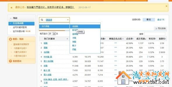 內容相當詳細,包括了: 關鍵詞 搜索次數 占比 點擊次數 商城點擊占比 搜索人數 點擊率 當前寶貝數 轉化率 直通車的平均出價。接下來,我們就可以從這里一個個尋找篩選我們需要的關鍵詞和長尾詞了。讓我們仔細看看我找的這個 “男休閑鞋2012新款”長尾詞。
