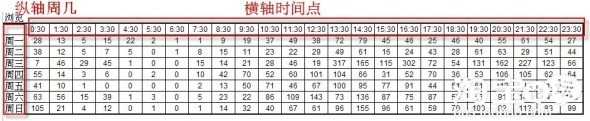 我們將這些數據拷貝的excel中,橫軸為時間點,縱軸為周一至周日。