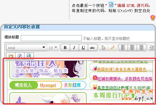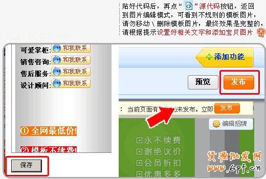 源代碼”按鈕,返回到圖片編輯模式,可以看到不規(guī)則的模板圖片,請(qǐng)勿移動(dòng)\刪除模板圖片,最終效果是完整的,請(qǐng)根據(jù)模板中的提示設(shè)置好相關(guān)的文字和添加寶貝圖片。