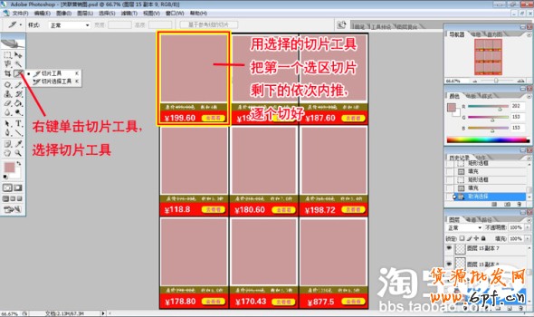 二、750的關(guān)聯(lián)圖做好后,這時(shí)我們就用PS的切片工具把每個(gè)寶貝寶貴下面的文字切成片,我的就是切成的九塊。