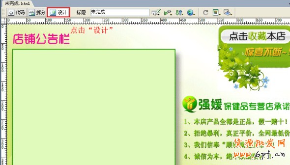6、把所有需要替換的全部替換完成之后我們也快大功告成了,復制粘貼到店鋪首頁的自定義,注意要切換到代碼再粘貼哦,旺旺圖標一定要記得替換,公告欄里的文字想讓它成為自下往上滾動的效果,我們還要從代碼做文章,切換到代碼在你做記號的那個位置也就是“插入內容”這個地方替換成代碼: