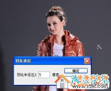 選擇"魔棒工具",容差設置為20,按住Shift工具 將不需要的背景部分選出來!為了得到更平滑的效果 我們需要把選擇區域邊緣羽化一下,設置5個像素: