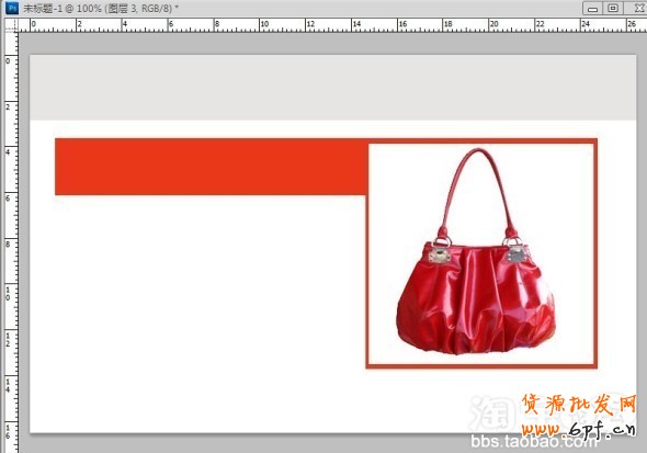 現在把你店鋪要參加淘寶限時折扣的寶貝主圖放進來,可以用QQ截屏再ctrl+v就放進來了,注意截屏的時候,要截成正方形哦,因為這個方框基本是正方形的,所以為了方便美觀,一定要仔細截好屏.然后用工具條的那個移動工具把我們的寶貝圖片放在正方形框內,可以用ctrl+t快捷鍵來調整大小記得按回車,調好了,看下圖,我在在百度里找了一個包包圖片入進來了,你們看.