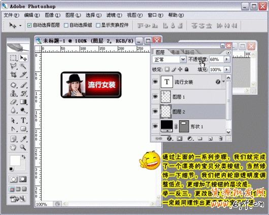 13.通過上面的一系列步驟,我們就完成了一個非常漂亮的寶貝分類按鈕,當然修飾一下細節(jié),我們把內(nèi)輪廓透明度調(diào)整低點,更增加了按鈕的層次感。舉一反三,更改圖片和文字,相信你一定能同理做出更漂亮的寶貝按鈕了。