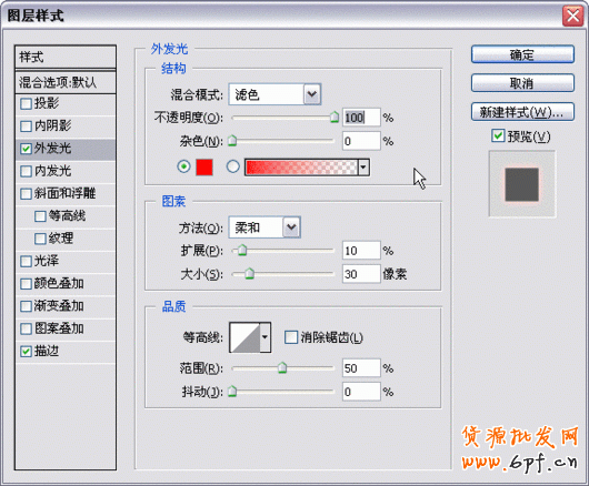 11.選擇文字圖層,按下圖層調(diào)板下面的“效果圖標”分別添加描邊和外發(fā)光兩種圖層特效。
