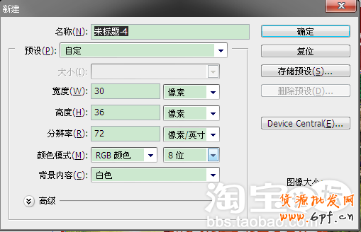 OK,打開窗口之后,我們就要開始制作秒鐘倒計時了,我們先要新建一個背景圖層,具體要建多大呢,剛剛我們上面講了,在切片的時候當切時分秒這幾個數字的時候我們用了固定的大小進行切片,是30*36的大小,所以我們現在只要新建這么大小的背景層就可以了,至于背景圖層的顏色,我們直接選擇白色就可以了,因為我們的模板背景是白色的,當然也可以選擇其他顏色,視具體情況而定。