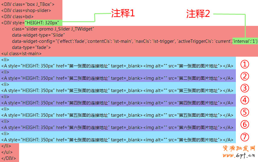 ①注釋1:用來改變你要的輪播模塊的高度,你只需把綠色部分的“320”修改成你要的數值就行了,其他的不管