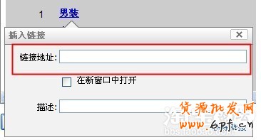 選擇文字進行以上操作,當你選擇鏈接以后,你就到你店鋪當中把你文字對應的鏈接地址復制到下圖的紅色區,同時可以有其它選擇(在新窗口中打開、描述):