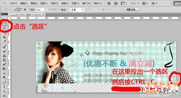 9.現(xiàn)在我們要制作邊框,因?yàn)轱L(fēng)格背景需要一樣,很簡(jiǎn)單的方法就是復(fù)制啦!打開我們剛剛制作完畢的模板圖片,然后使用“選區(qū)”工具拉出一個(gè)選區(qū)之后復(fù)制。