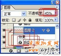2、選擇“矩形工具”在背景圖上繪制出公告區(qū)、聯(lián)系我們及人氣寶貝這三個區(qū)域所在位置,并分別將其所在的圖層的不透明度改為45%,并在圖層混合選項中選擇“投影”效果(這在前面店招制作和分類圖片制作中已說明,所以在此并不再次說明)。