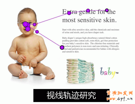這是一張嬰兒紙尿褲的平面廣告初稿,并不是很有創(chuàng)意,因?yàn)樗a(chǎn)品的賣點(diǎn)是用文字說明的(大標(biāo)題)。初稿完成后老外們找了很多的人來看,記錄下他們?yōu)g覽不同位置的先后順序和重點(diǎn)查看的位置,來進(jìn)行視線軌跡研究,發(fā)現(xiàn)人們往往把他們的賣點(diǎn)(大標(biāo)題)放在最后瀏覽。那么這些人是否對(duì)大標(biāo)題產(chǎn)生深刻的印象了呢?于是他們又做了另外一個(gè)實(shí)驗(yàn):