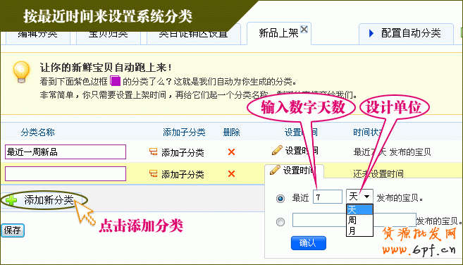 這種場(chǎng)景可用【寶貝自動(dòng)分類】--“按上架時(shí)間分類”