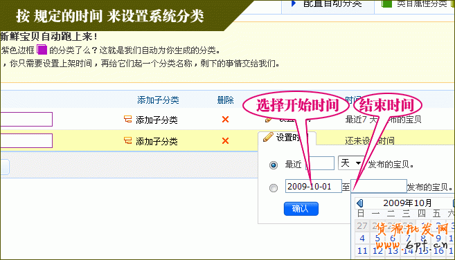 進(jìn)入設(shè)置頁(yè)面,如下圖所示,基本上與原有分類沒(méi)多大區(qū)域,重要的是設(shè)計(jì)寶貝例表,直接設(shè)置時(shí)間即可。如圖所示!