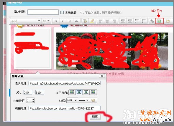 接下來給模板內 添加自己的寶貝圖片 點擊 插入圖片 輸入 圖片地址 鏈接地址 點擊確定