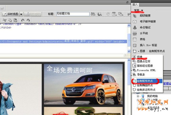 當(dāng)當(dāng)當(dāng),我們的圖片出現(xiàn)在空白處了,但是也還是不動的,這個我們先不管了,被點住穴了,呵呵,等下解開了自然能動。這時我們把鼠標(biāo)移到右上邊的常用菜單下的圖像下拉的繪制矩形熱點,因為我們的圖片是四方的,所以選這個,如果需要做圓形的就點繪制橢圓熱點,如果是不規(guī)則的就點繪制多邊型熱點。