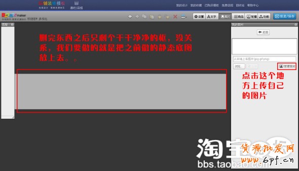 接著先取個底圖,不想要的東西可以先刪掉,動態的動畫也可以先刪掉,因為做出來的FLASH不能直接應用到店鋪里。做好后點“預覽/保存”。 注:如果之前沒登陸,記得要點畫面左上角的“登陸”,不然輸出的時候不能作為自己的作品保存起來。