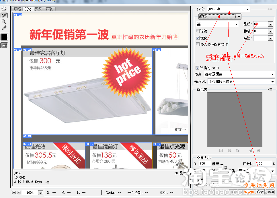 有的新手朋友可能會說,這好不容易組成了一個整體圖,現在又要劃分,真費事。 哈哈,是費了點事,但是,如果不劃分,整圖傳到淘寶網店,會嚴重影響打開網店網頁的速度,為了加快速度,這一步是必不可少的。