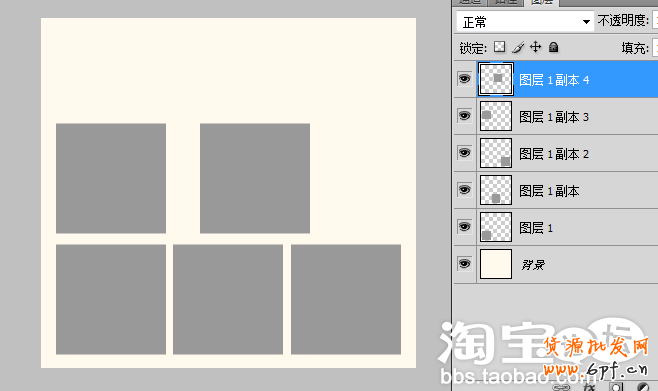→此時我們選擇工具欄第二個工具即移動工具(按v健選擇移動工具)并勾選自動選擇選項→單擊一下畫布中我們剛才繪制的灰色色塊(一定要單擊到色塊的范圍內才有效)→按下alt鍵的同時按下鼠標左鍵不放移動色塊至其它位置,松開左鍵后松開alt鍵。這樣我們就復制了一個色塊,以同樣方法復制五塊灰色塊,可以看到我們每復制一個色塊后都產生了一個圖層副本,如圖