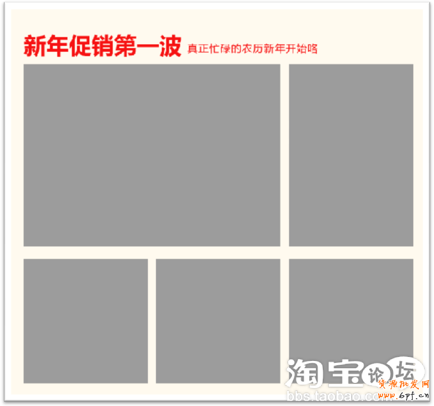 單擊選擇工具欄上T字形工具即文字工具(有的版本可能是中文漢字的“字”),填入相關的參數,字體可任意選擇。在畫布的上方輸入文字: 新年促銷第一波→同樣方法,輸入大小為18的文字“真正忙碌的農歷新年開始咯” →按第四步中講到的移動色塊的方法,同樣將文字移動到合適的位置。這樣背景為米黃色,色彩代表促銷圖片內容的簡單的布局圖就完成了,效果如下圖所示,保存文件為促銷.psd