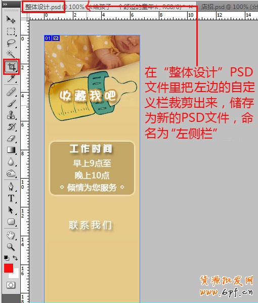 調整好圖片位置后先做些整體的設計,如加入店名、收藏我吧、工作時間等,也可以在適當的位置添加圖片,自我發揮吧。需要提醒的是,此步僅作靜態的設計,動畫設計等請不要在這步做出,待下面存儲為獨立的“店招”、“左側欄”和“自定義促銷欄”PSD文件后再編輯。
