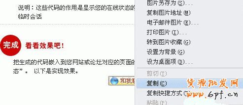 輸入自己的旺旺名稱并生成代碼后,頁面最底下會顯示效果圖,直接右鍵旺旺圖標(biāo),選擇“復(fù)制”即可,如下圖: