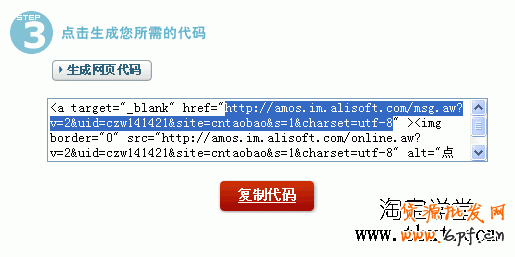 我們輸入自己的旺旺名稱,生成的代碼當(dāng)中就包含相應(yīng)的鏈接地址,如下圖,我們選中的區(qū)域就是,直接復(fù)制過去就行了: