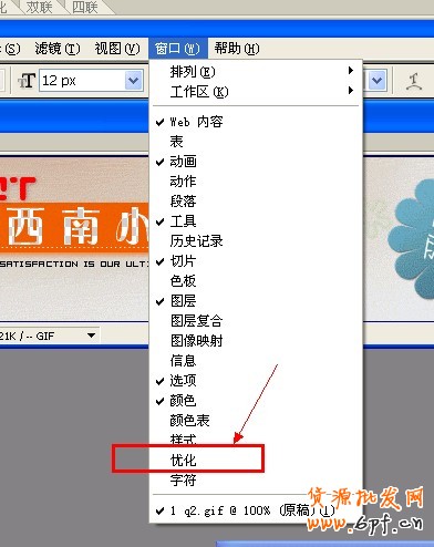 1.如果沒有看到這個優化窗口,你可以在Adobe ImageReady CS2的菜單依次點“窗口”-“優化”打√調出優化窗口。