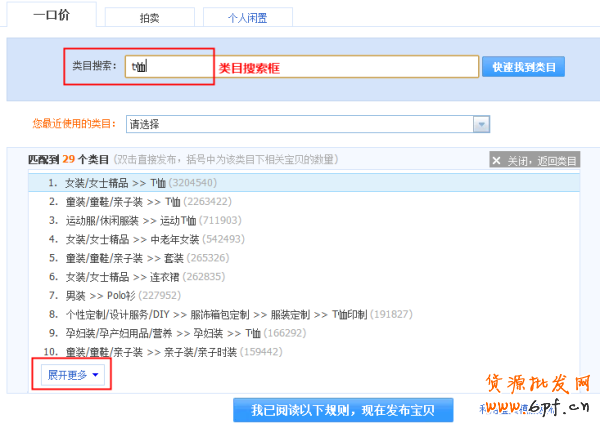 如果之前已經發布過相同類目的商品,再次發布的時候,可直接點擊“您最近使用的類目“選擇相應的類目即可。在這里會展示最近發布過的10個類目哦。