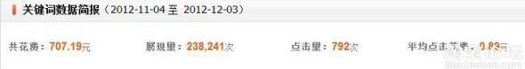 B、開(kāi)起直通車(chē)。直通車(chē)讓許多賣(mài)家又愛(ài)又恨,小學(xué)生也是一樣的感覺(jué),開(kāi)嘛,本來(lái)訂單跟利潤(rùn)又不大,開(kāi)了鐵定坑爹,虧本!不開(kāi)嘛,又沒(méi)有流量,買(mǎi)家在漫漫商品海中無(wú)法關(guān)注你!痛定思痛之下,還是開(kāi)起了!剛開(kāi)的第一天,因?yàn)樵O(shè)置不當(dāng),一個(gè)小時(shí)一百塊就燒沒(méi)了,一單也沒(méi)有成交,大呼坑爹,傷不起啊!后來(lái)玩命的論壇找帖子學(xué)習(xí),最終定下了廣撒網(wǎng),撈小魚(yú)的直通車(chē)策略:即全店鋪所有產(chǎn)品投滿200個(gè)關(guān)鍵詞,所有關(guān)鍵詞出價(jià)都很低,這樣你在花費(fèi)不大的前提下,也能獲得不錯(cuò)的流量,下面是我這一個(gè)月的直通車(chē)花費(fèi)圖,點(diǎn)擊量雖然不高,但是轉(zhuǎn)化率不錯(cuò),點(diǎn)擊進(jìn)來(lái)的肯買(mǎi),一個(gè)可能是我的產(chǎn)品定價(jià)跟定位不錯(cuò),另一個(gè)也可能是買(mǎi)家翻到后面了,懶得再找