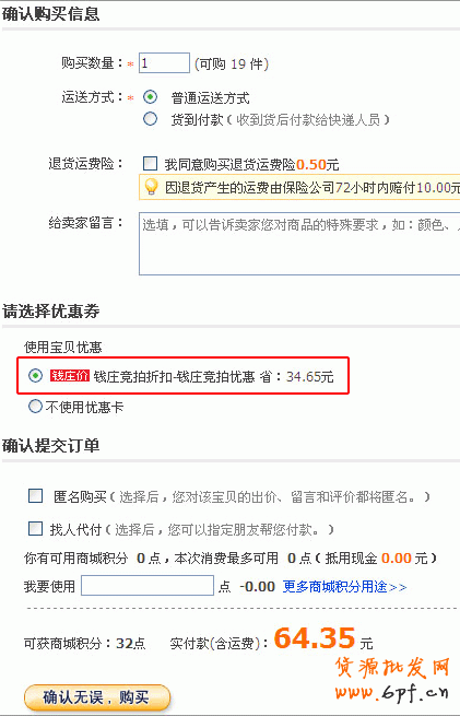 5.填寫完整收貨地址、運(yùn)送方式、給賣家留言等相關(guān)信息,最后點(diǎn)擊“確認(rèn)無誤,購買”按鈕。