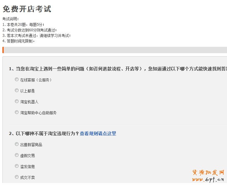 點擊開始考試后就可以開始了,考試題目都很簡單,大家可以參考淘寶規則,或者在淘寶學堂網站上直接搜索會有答案