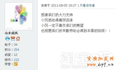 顧名思義就是在論壇中發帖,發精華帖。我在淘寶論壇中發帖有三十幾篇,百分之九十都是寫如何進行推廣,平均有六人恢復,最多三十人回復,雖然不多,還有垃圾廣告占位,但我使用了一個重要的推廣方法:回復我帖子的人,我都會去他的店鋪逛一逛,并且加入收藏!這點非常重要!!