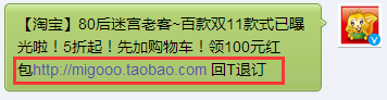 “【淘寶】80后迷宮老客~百款雙11款式已曝光啦!5折起!先加購物車!領100元紅包http://migooo.taobao.com 回T退訂”