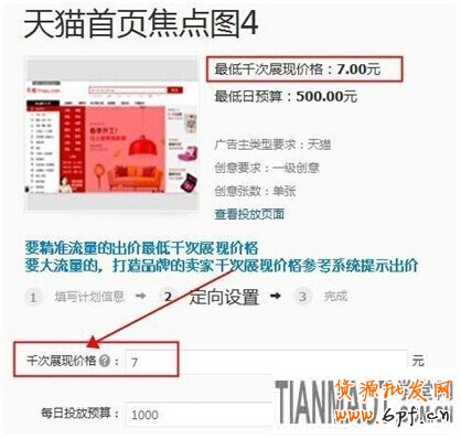 如果您想流量來自定向,那么千次展現(xiàn)價格建議設(shè)置到該展位的最低,如說淘寶首焦的最低千次展現(xiàn)價格是7元,我們就出價7元,降低被通投的幾率 。