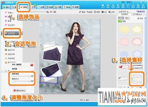 第三步:選擇"飾品/會話氣泡"或者是閃圖都可以,主要是看您自己的需要。然后添加漂亮素材。在藍色編輯框內,可以調整素材的角度、大小。