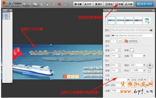 這里有點技巧,大家有沒有覺得一張圖片展示有點不大盡興呢,我這里巧用了falsh模板中的圖片輪播功能,這里最多可以展示五張圖片,大家可以充分發揮自已的創作空間,到網上多找找素材,制作幾張漂亮的圖片,突然是不是發現相當于展示了五個店招哦。