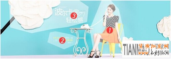 總結一下上面舉出例子的圖片設計技巧,顏色黑白橙黃,要突出夏天的靜謐的感覺→于是采用夏天天空藍色為背景主色,用白色來輔助→產品亮點是波爾卡圓點,于是把字體定位成準圓體,并對其進行修飾,突出圓點這個概念元素→產品本身是優雅高貴的氣質,于是摒棄了白云這個元素,改用玫瑰花來點綴,再加上陰影的襯托,對比感覺使得這個元素帶來的感覺更加直觀→注意留白,來大家足夠的思維空間來創造他需要賦予這個設計的情感。