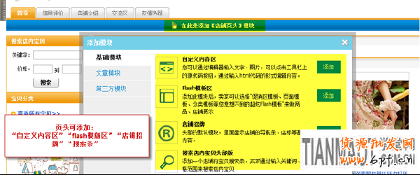 頁頭可以包含以下幾個預置的模塊:自定義區、flash模塊區、店招、和搜索條,組成自定義布局,具體放置什么模塊,都隨掌柜自由添加或刪除: