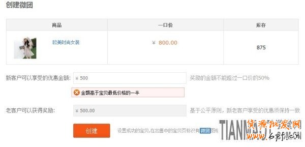 參團人享受的折扣是通過發放微團專用的寶貝優惠券的方式實現的,設置金額不能高于商品最低價格的一半。發起人返利金額與參團人優惠券金額一致,不需要填寫。點擊創建后,即可發布成功。
