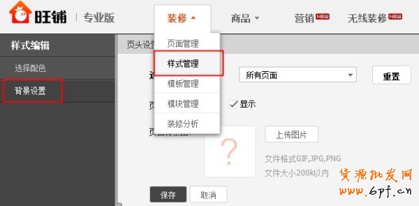 a、點擊“裝修”→“樣式管理”→“左側背景設置”→“頁面設置”