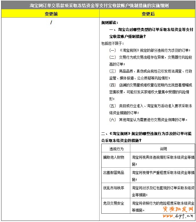 1、新增市場管理情形:為保障買家的消費(fèi)權(quán)益,淘寶有權(quán)基于資金安全風(fēng)險、商品合規(guī)風(fēng)險等評估,對資金安全風(fēng)險、商品合規(guī)風(fēng)險較高的訂單或其他需要進(jìn)行交易資金保障的訂單采取凍結(jié)資金等支付寶收款賬戶強(qiáng)制措施;