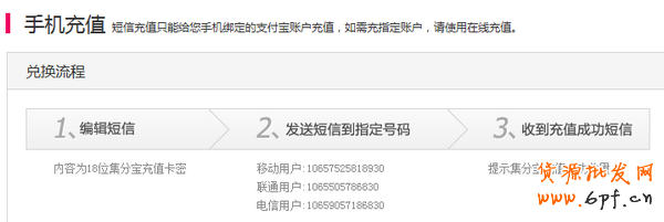 方式二:手機(jī)充值——用戶自行編輯卡號(hào)、密碼發(fā)送至指定短信號(hào):除了在線充值以外,還可通過(guò)手機(jī)短信的方式 給手機(jī)綁定的支付寶賬戶充值集分寶。編輯一條包含18位充值卡密的短信發(fā)送到指定號(hào)碼即可完成充值。