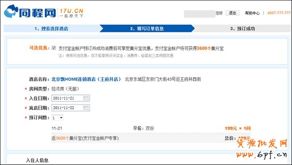 4、確認酒店后需要填寫訂單信息。在該頁面將提示預(yù)訂成功后返集分寶的數(shù)量;