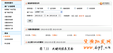 使用報表可以隨時直觀地檢驗我們的推廣效果。淘寶直通車為我們提供了很多種數(shù)據(jù)分析服務,包括賬戶報表、寶貝報表、關(guān)鍵詞報表、時段報表、地域報表及平臺報表。通過對各類數(shù)據(jù)的分析,你可以及時了解到自己推廣設置的不足之外并加以改正和彌補,如圖所示。
