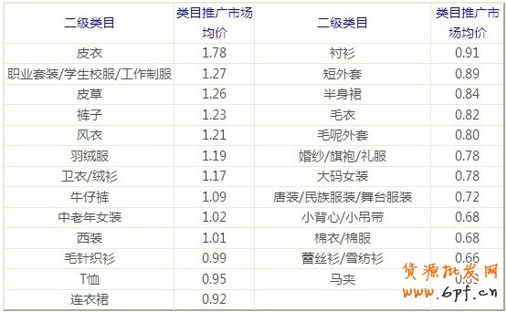 在一個品類的市場剛開始上升的時候,很多買家都是比較容易被引導去購買的,因為這個時候消費者可能還不知道今年的流行趨勢是什么,很多買家都不會輸入具體的關鍵詞而是進行類目搜索。所以賣家在這個時候進行類目推廣往往比市場完全熱了以后轉化率和效果會更好。掌柜請在所推廣的寶貝上都進行類目出價,出價的可以根據目前各二級品類的類目推廣市場均價進行調整: