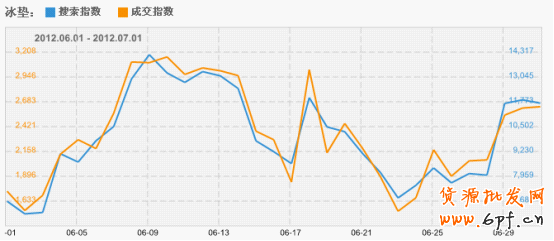 進入6月以后,冰墊經過了9號、12號、18號三次銷售高峰之后,市場有下滑的趨勢,直到6月底,即6月29號冰墊再次達到了一次小高潮。