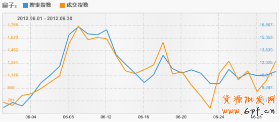 目前扇子市場表現良好,6月中旬開始扇子賣瘋了。淘寶指數數據顯示,6月9號,12號,18號出現了搜索和成交的幾次波峰。在6月25號再次出現一個小波峰。