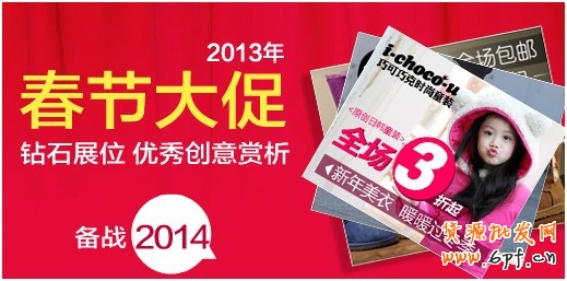 同時(shí):鉆展小二貼心為您解析2013年春節(jié)大促季女裝,男裝,美容護(hù)膚,箱包鞋類,童裝,食品等10大類目高點(diǎn)擊創(chuàng)意元素,2014春節(jié)創(chuàng)意不再愁。
