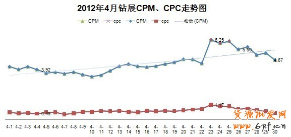 4月整體CPM價(jià)格在穩(wěn)定中上漲,其中4月23-25日為峰值,主要原因是三天的天貓新風(fēng)尚活動(dòng)競價(jià)客戶增多;CPC平均0.7元,23日達(dá)到了1.17元。可見淘寶官方活動(dòng)直接影響鉆展大盤競價(jià)情況,CPM價(jià)格活動(dòng)期間比平時(shí)增加1/2, 掌柜們可把握好最優(yōu)的推廣時(shí)間,方可減低成本。