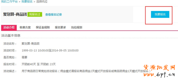 在“活動詳情”中你可以了解:活動介紹、收費(fèi)方案、保證金規(guī)則、報名要求、坑位規(guī)劃,同時點(diǎn)擊“我要報名”進(jìn)行報名。